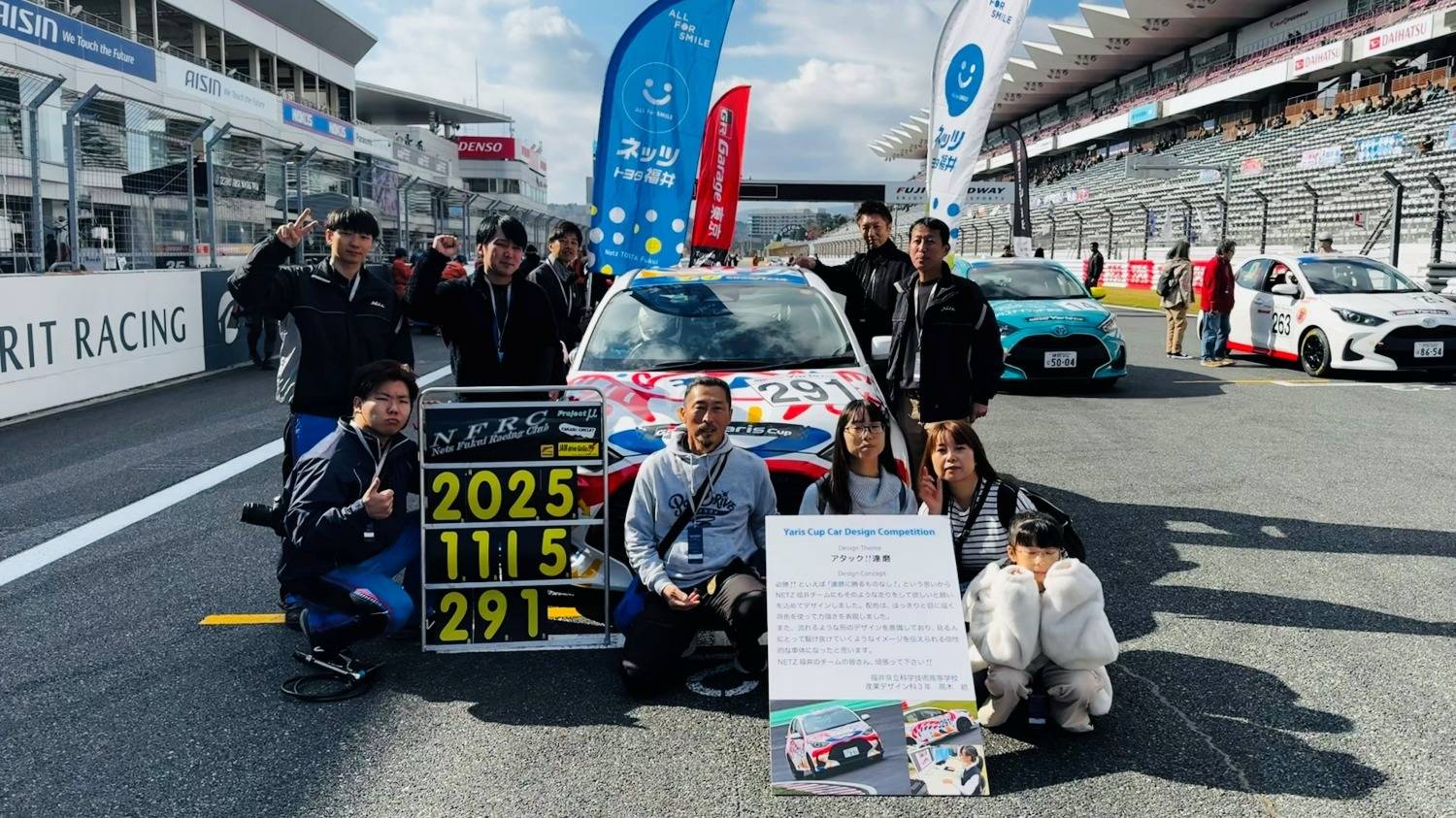 出走が1台となった事と、291号車のデザインをしてくれた生徒さんとご家族が観戦応援に来ていただいたので、